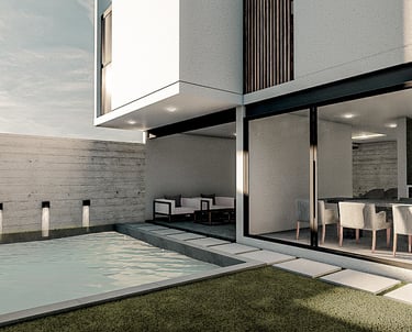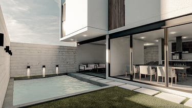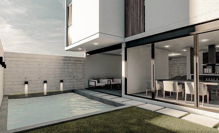 El proyecto consta de 3 recámaras con baño y balcón, 1 baño completo extra, sala, cocina, comedor, cuarto de lavado, jardín, alberca de 4.00 x 4.00 m, terraza interior y estacionamiento para 2 vehículos.